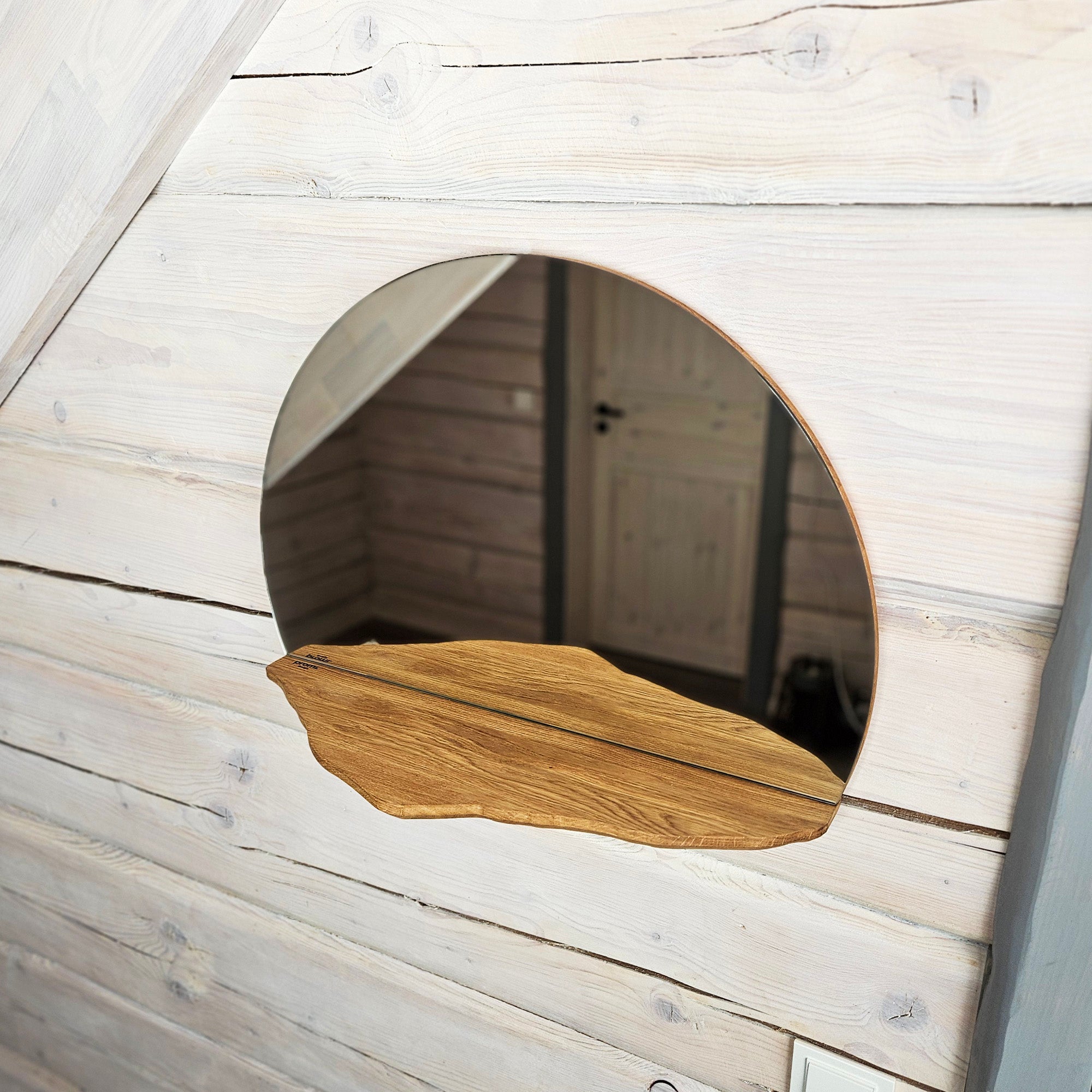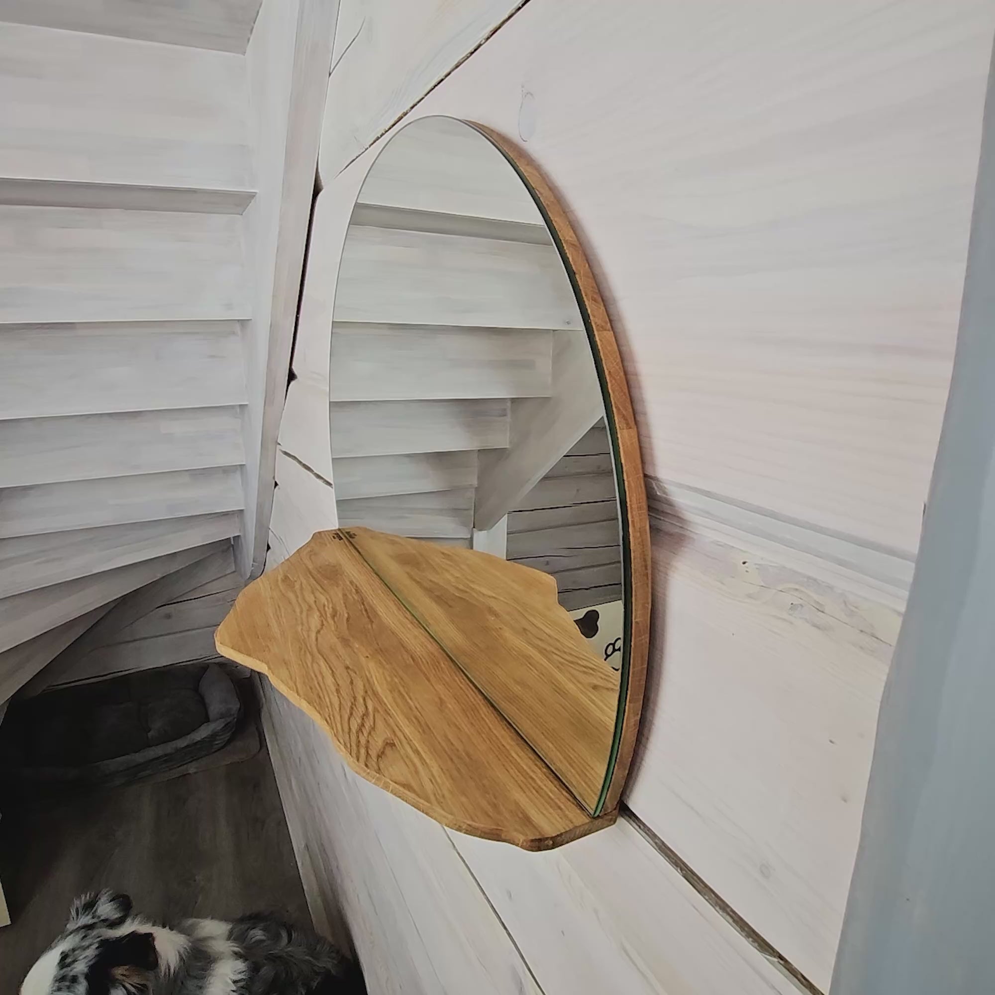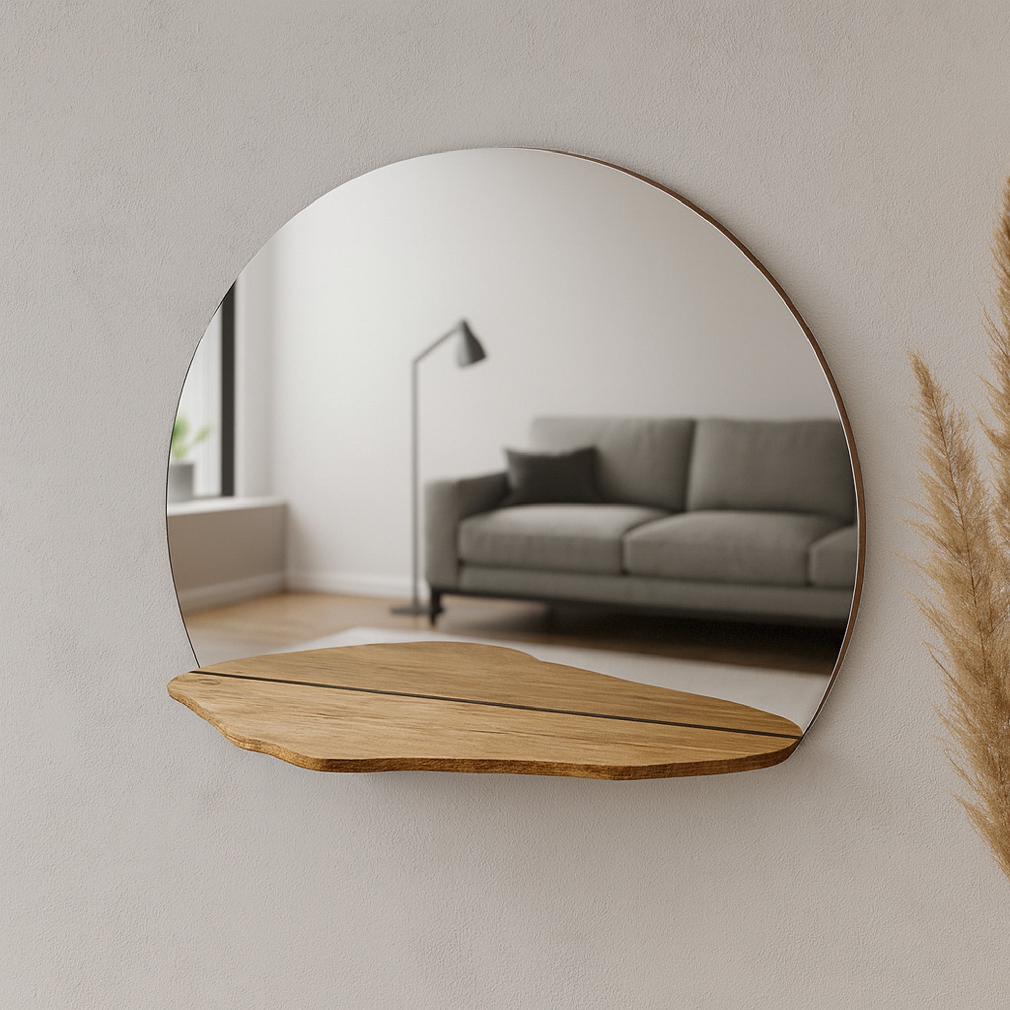 Stilingas apvalus veidrodis su lentyna puikiai papuoš svetainę, miegamąjį ar koridorių. Lentyna suteikia vietos smulkiems daiktams, žvakėms ar aksesuarams, o minimalistinis dizainas dera tiek su moderniu, tiek su skandinavišku stiliumi. Tai praktiška ir elegantiška namų dekoracija.