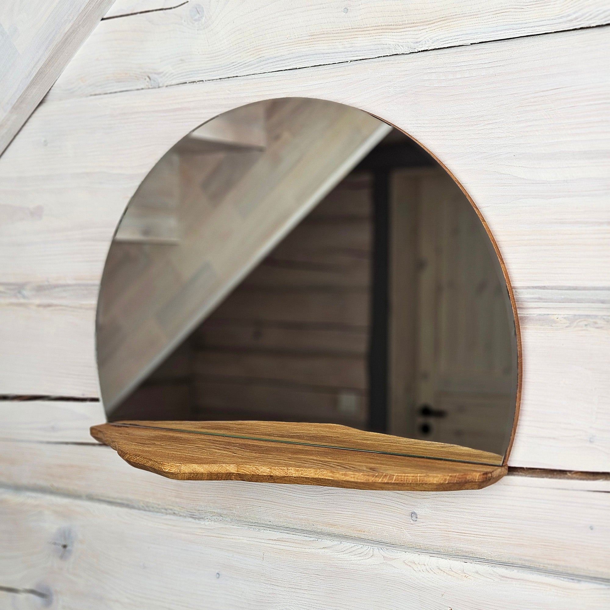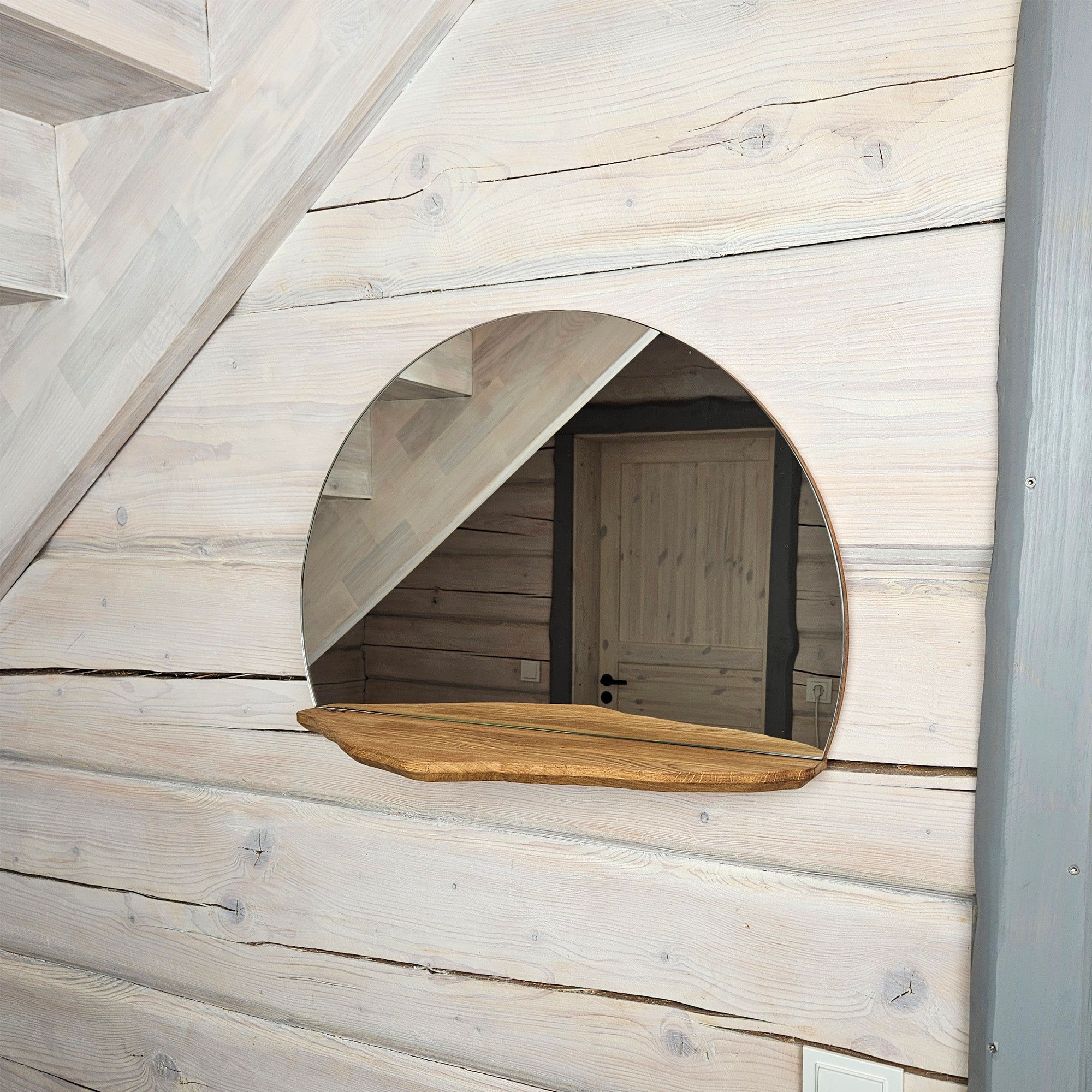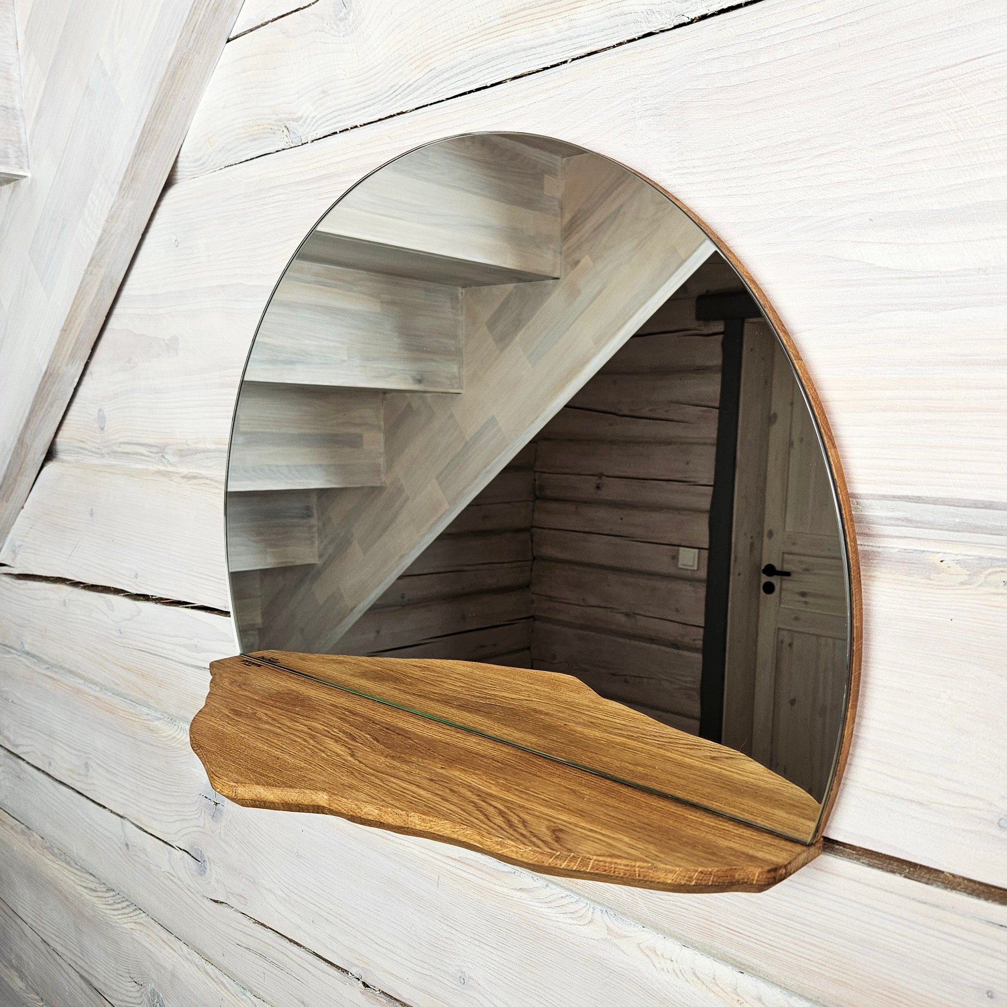 Stilingas apvalus veidrodis su lentyna puikiai papuoš svetainę, miegamąjį ar koridorių. Lentyna suteikia vietos smulkiems daiktams, žvakėms ar aksesuarams, o minimalistinis dizainas dera tiek su moderniu, tiek su skandinavišku stiliumi. Tai praktiška ir elegantiška namų dekoracija.