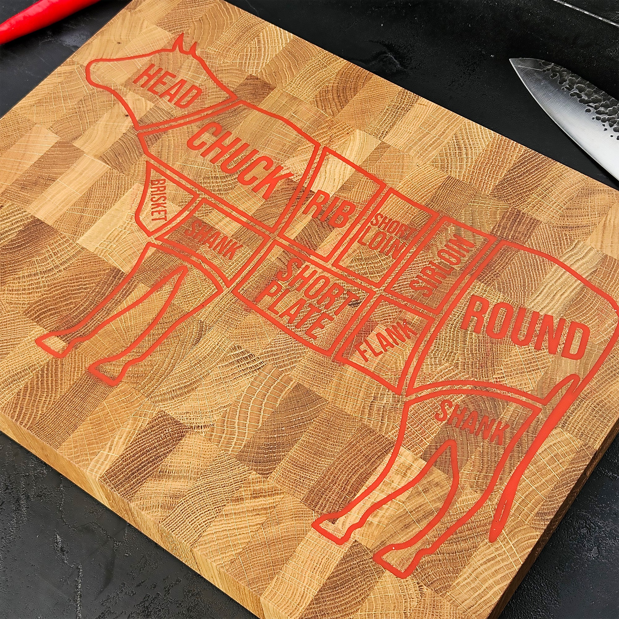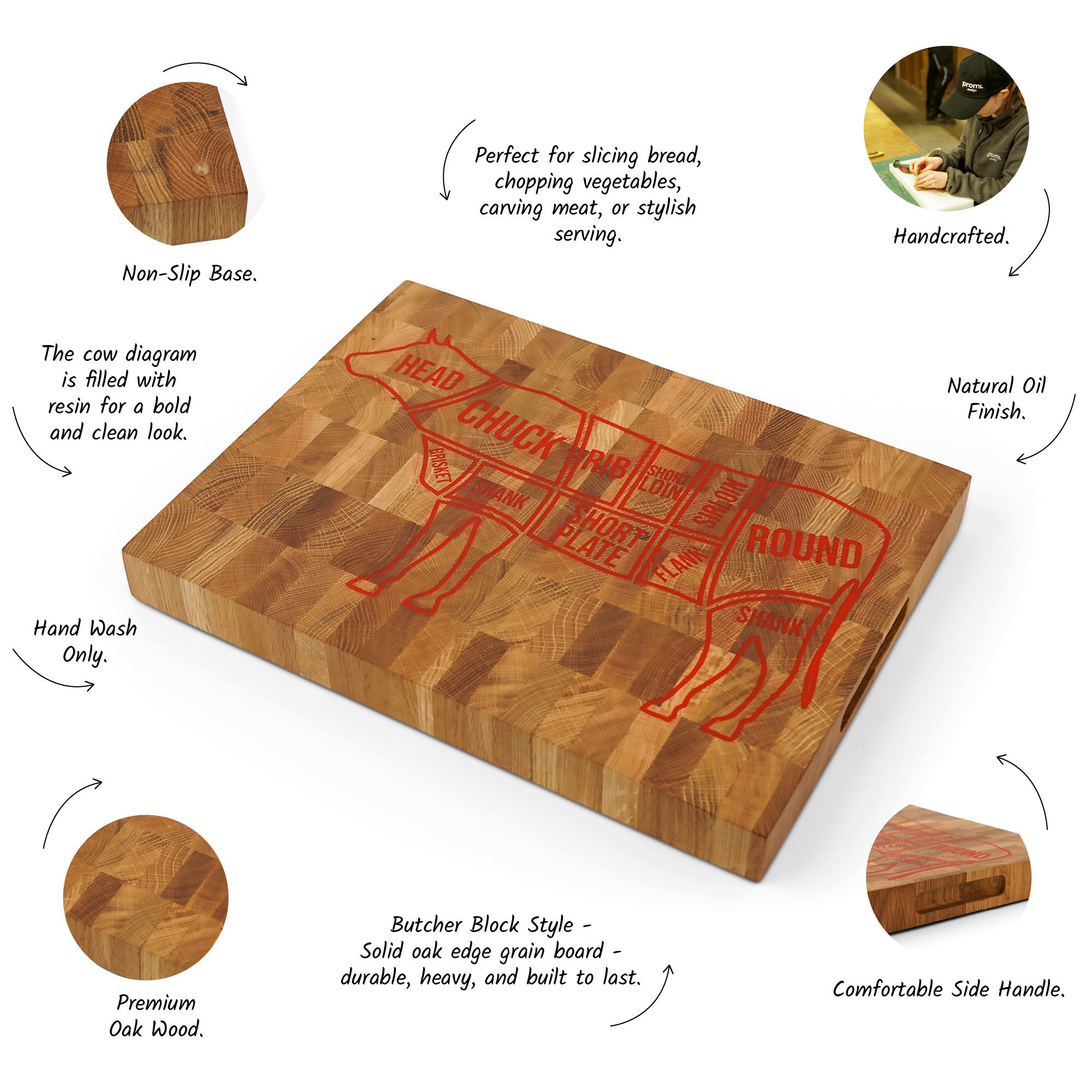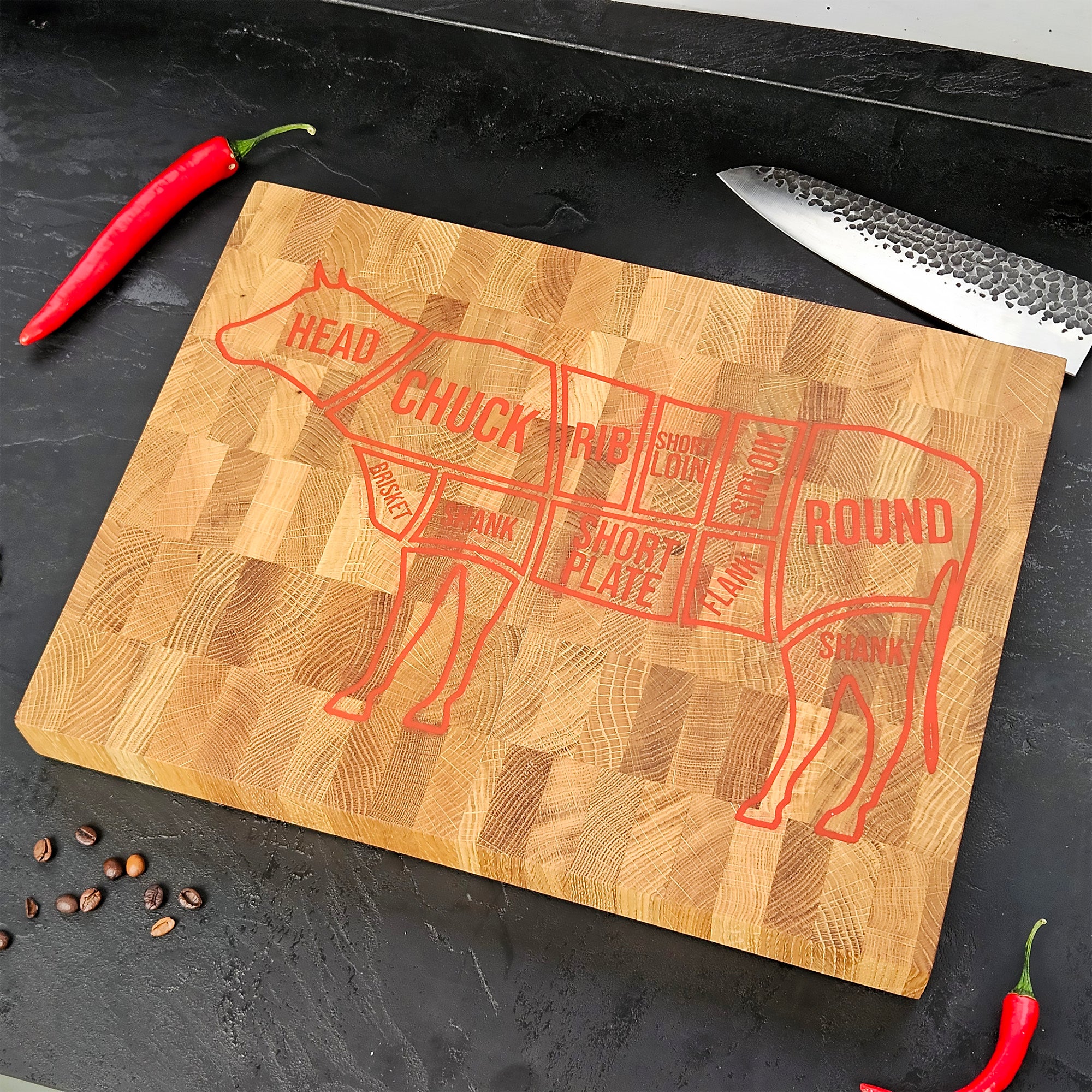 Rankų darbo ąžuolinė pjaustymo lentelė, tai tvirtas ir stilingas virtuvės aksesuaras. Patogios rankenos leidžia lengvai ją pernešti, o dekoratyvus karvės paveikslėlis suteikia žaismingą akcentą. Medinė pjaustymo lenta lengvai prižiūrima ir puikiai tinka kaip dovana ar stilingas virtuvės elementas.