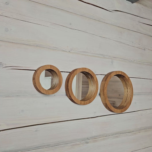 Trijų sieninių veidrodžių rinkinys, pagamintas iš masyvaus ąžuolo medienos. Kiekvienas medinis veidrodis yra skirtingo dydžio, pagamintas rankų darbo. Rinkinys puikiai tinka tiek šiuolaikiniam, tiek kaimiškam interjerui – nuo svetainių ir miegamųjų iki biurų ar komercinių erdvių. Šie sieniniai veidrodžiai ne tik optiškai praplečia erdvę, bet ir suteikia jai jaukumo bei natūralaus charakterio.
